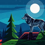 È notte. Il cielo è di un colore blu scuro, quasi verde. C’è una luna grandissima e bianca. La luna brilla molto forte e illumina tutto il bosco. Ci sono tante piccole stelle nel cielo che sembrano diamanti. Al centro della scena c’è una gatta di nome Nerina, piccola e molto curiosa, seduta sopra un ponte di legno. Sotto il ponte c’è un piccolo fiume calmo e pulito, dove si vede il riflesso della luna e della gatta.